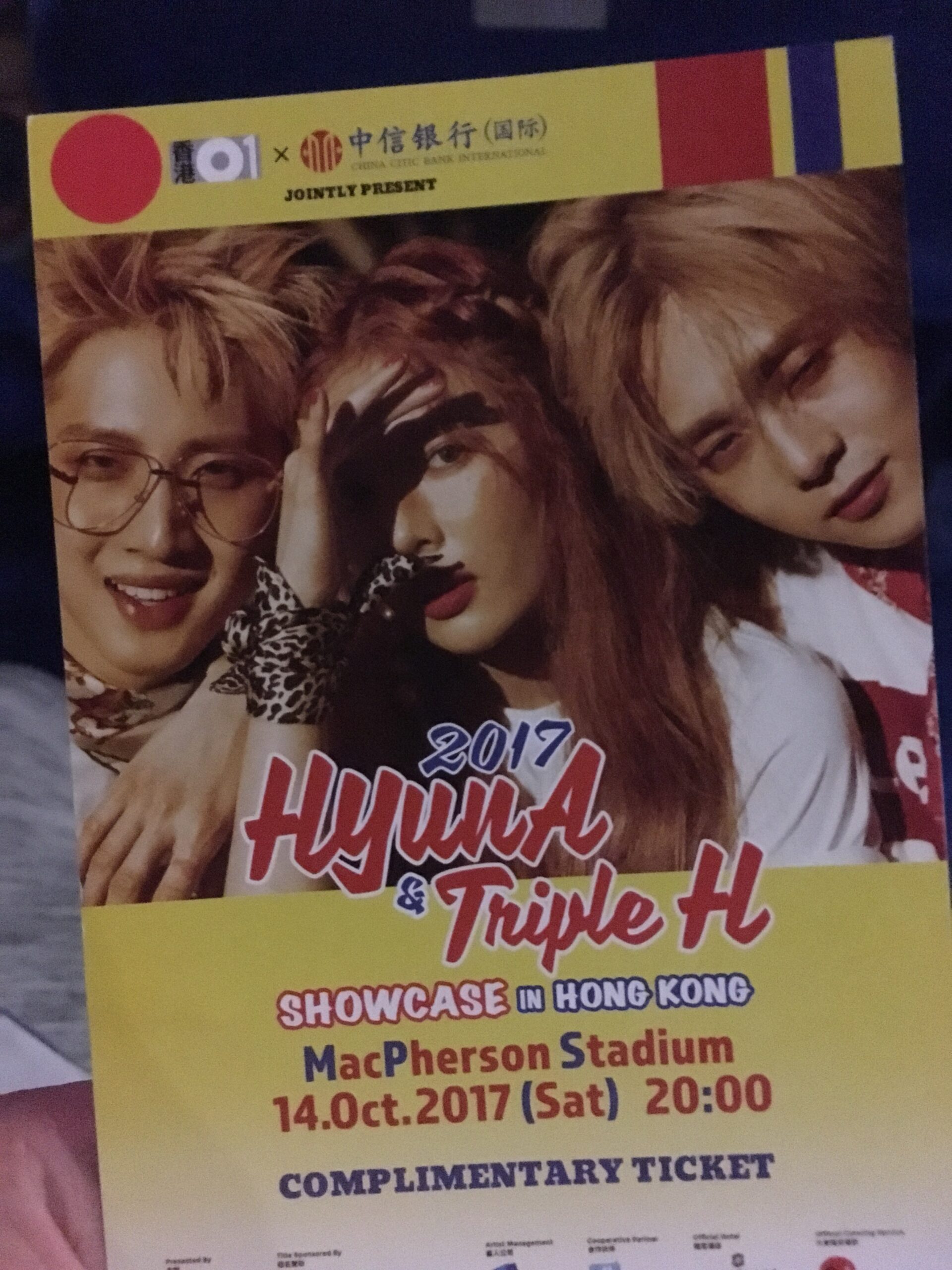 還是得感謝朋友的招待,可以在現場觀看Hyuna and Triple H Showcase 2017。兩個小時又跳又唱,大致上是精彩的,而有幸看到泫雅真人演出又是另一回事,那種動力與活力是絕對足夠技壓舞台的。同行的兩位男生亦傾力演出,有讓我對韓國藝能界有一點點改觀。